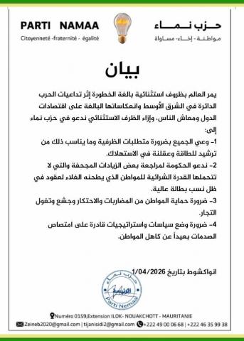 يمر العالم بظروف استثنائية بالغة الخطورة إثر تداعيات الحرب الدائرة في الشرق الأوسط وانعكاساتها البالغة على اقتصادات الدول ومعاش الناس، وإزاء الظرف الاستثنائي ندعو في حزب نماء إلى: