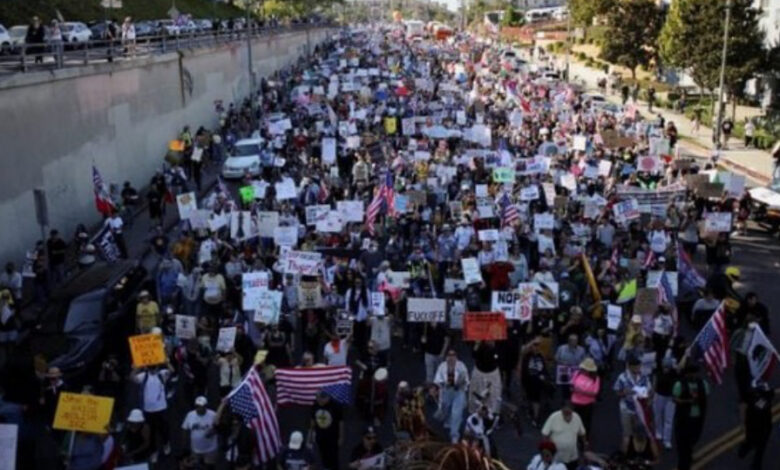 اجتذبت المظاهرات المناهضة للرئيس الأميركي دونالد ترامب أمس السبت حشودا ضخمة في جميع أنحاء البلاد، حيث احتجت حركة “لا للملوك” على ما تراه سياسات ترامب “السلطوية”.