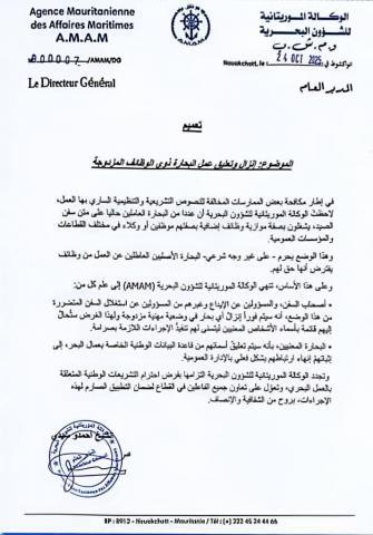 الوكالة الموريتانية للشؤون البحرية (AMAM)، في تعميم صادر عن مديرها العام الشيخ أحمدو سيدي، إن بعض البحارة العاملين على متن سفن الصيد يشغلون في الوقت ذاته وظائف إضافية كموظفين أو وكلاء في مختلف القطاعات والمؤسسات العمومية، وهو ما يخالف النصوص التشريعية والتنظيمية السارية.