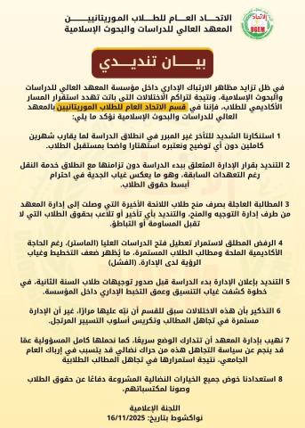 في ظل ما تشهده إدارة المعهد العالي للدراسات والبحوث الإسلامية من ارتباك متزايد، وتفاقم الاختلالات التي باتت تهدد استقرار المسار الأكاديمي للطلاب، فإننا في قسم الاتحاد العام للطلاب الموريتانيين بالمعهد نسجل ما يلي: