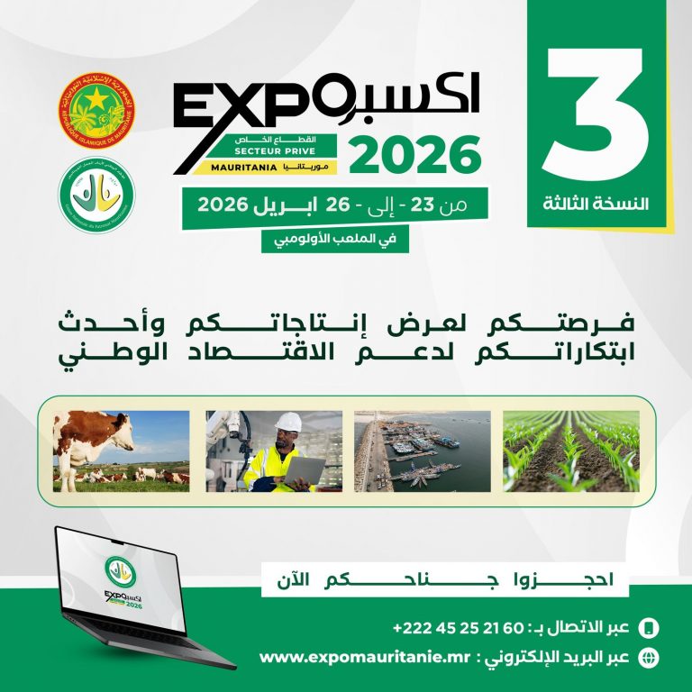 أعلن الاتحاد الوطني لأرباب العمل الموريتانيين تنظيم النسخة الثالثة من المعرض الوطني للقطاع الخاص “أكسبو موريتانيا 2026”، وذلك بعد النجاحات التي حققتها الدورتان السابقتان في عامي 2024 و2025، في إطار ترسيخ هذا الحدث كموعد سنوي يجمع مختلف الفاعلين الاقتصاديين في البلاد.