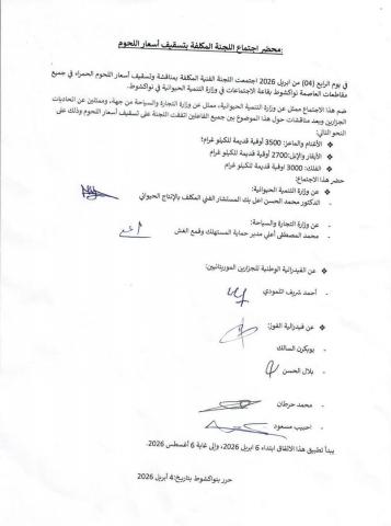 أُعلن، زوال اليوم السبت، بمباني وزارة التنمية الحيوانية في العاصمة نواكشوط، عن اعتماد قرار رسمي يقضي بتسقيف أسعار اللحوم الحمراء، على أن يبدأ العمل به اعتبارًا من يوم الإثنين الموافق 6 أبريل الجاري.