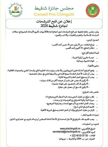 أعلن مجلس جائزة شنقيط عن فتح باب الترشحات لدورة 2026، وذلك في إطار سعيه إلى تشجيع البحث العلمي والإبداع الفكري، وتكريم الأبحاث والأعمال المتميزة في مجالات الدراسات الإسلامية، والعلوم والتقنيات، والآداب والفنون.