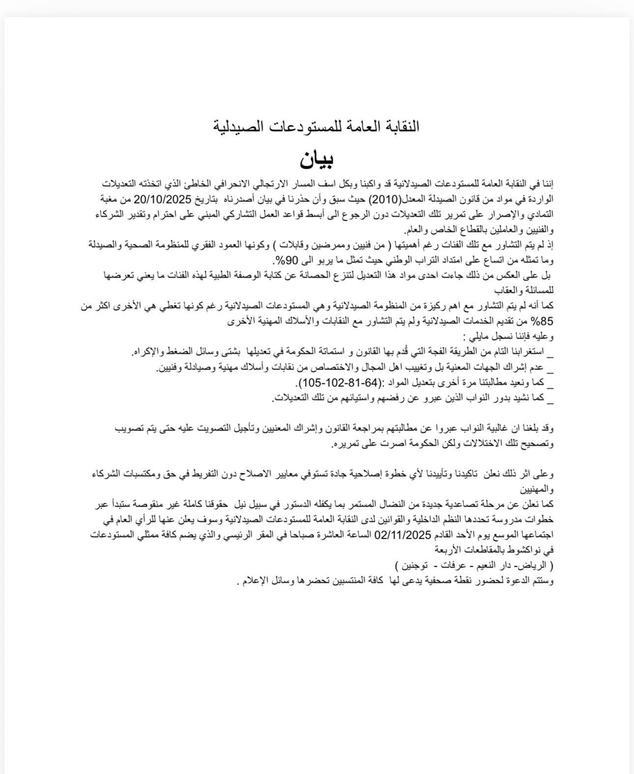 إننا في النقابة العامة لمستودعات الصيدلية قد واكبنا بكل أسف المسار الارتجالي الانحرافي الخاطئ الذي اتخذته التعديلات الواردة في مواد من قانون الصيدلة (المعدل 2010)، وقد سبق وأن حذرنا في بيان أصدرناه بتاريخ 20/10/2025 من مغبة ذلك.