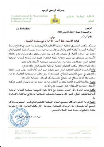 ودعت النقابة كافة منتسبيها إلى رصّ الصفوف وتعزيز وحدة الموقف، مؤكدة تمسكها بجميع الوسائل النضالية والميدانية التي يضمنها القانون، دفاعًا عن حقوقها المادية والمعنوية، وحفاظًا على هيبة الأستاذ الجامعي ومكانته داخل المؤسسة الجامعية.