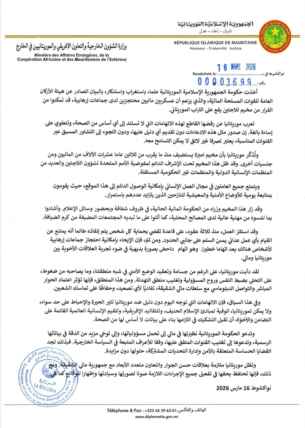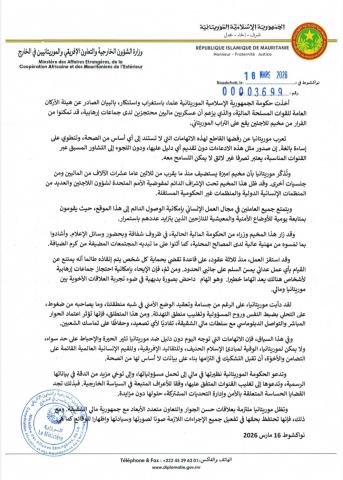وفي بيان صادر الاثنين عن وزارة الشؤون الخارجية والتعاون الإفريقي والموريتانيين في الخارج، رفضت موريتانيا بشكل قاطع هذه الادعاءات، مؤكدة أنها اتهامات باطلة لا تستند إلى أي دليل، وتنطوي على إساءة بالغة. وشدد البيان على أن ما ورد في التصريحات المالية لا يعكس واقع الأوضاع داخل مخيمات اللاجئين في البلاد.