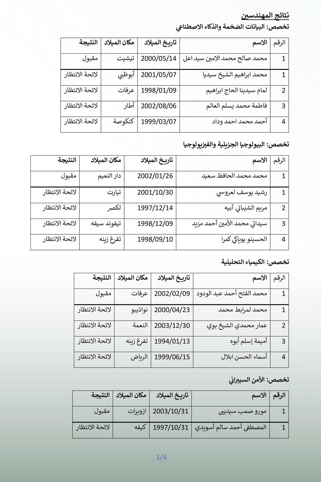 أعلنت الإدارة العامة للأمن الوطني عن نتائج مسابقة اكتتاب مهندسين لصالح جهاز الأمن، وذلك من رتبتي المفتشين الرئيسين والمفتشين، داعية الناجحين إلى الحضور إلى مباني الإدارة العامة صباح الثلاثاء عند الساعة الثامنة، لاستكمال الإجراءات الإدارية المطلوبة.