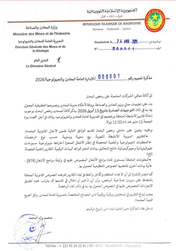 وطالبت الوزارة بإيداع التقارير في نسختين، ورقية ورقمية، لدى المصالح المختصة، مع التقيد بالصيغ الفنية المعتمدة، مؤكدة أن هذا الإجراء يهدف إلى تعزيز الشفافية وتحسين حوكمة قطاع المعادن.